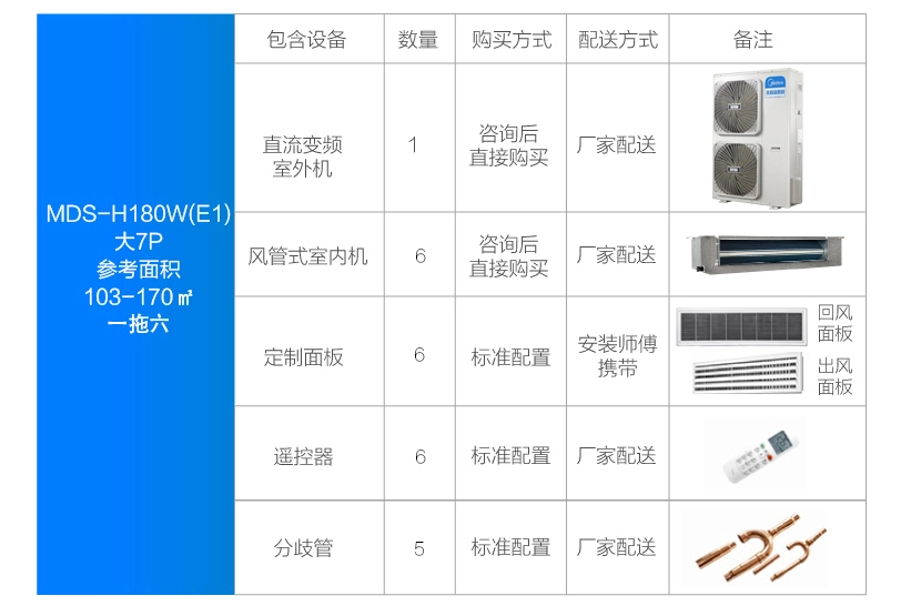 美的 一拖六變頻一級(jí)能效 多聯(lián)風(fēng)管機(jī) 7匹 家用中央空調(diào) MDS-H180W(E1)